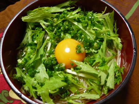 水菜の月見風そうめん:477kcal (そうめん2束、めんつゆ、卵黄、水菜、小ねぎ)