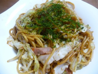 油、オイスターソース、粉末ソース〔市販の焼きそばに付属〕、バター)