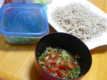 (そば、トマトつゆ〔めんつゆ、トマト、ごま油〕、長ねぎ、小ねぎ、みょうが、すりごま、わさび)