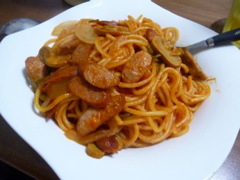 (スパゲティ、チョリソー、玉ねぎ、ピーマン、マッシュルーム、ケチャップ、バター、調味料...)