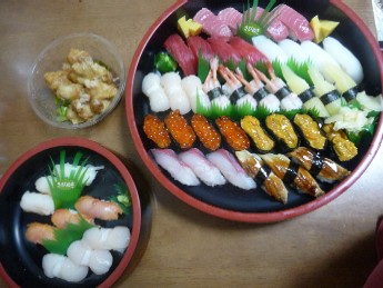 (まぐろ2貫、いか2貫、帆立3貫、うに2貫、中トロ、甘えび、数の子、はまち、つぶ貝)