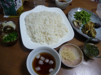 (そうめん、めんつゆ、めかぶ、なす、いんげん、みょうが、しょうが、小ねぎ、ねぎ、すりごま)