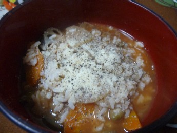 スープリゾット風:271kcal (ごはん、野菜たっぷりスープ、ケチャップ、パルメザンチーズ)