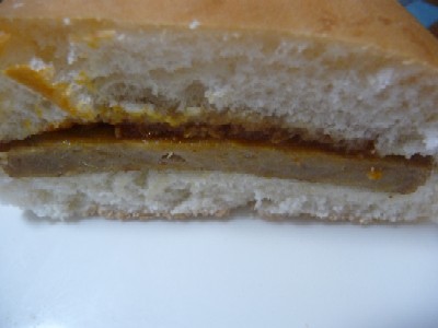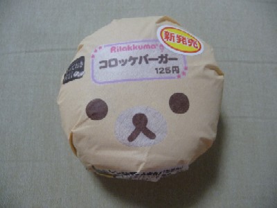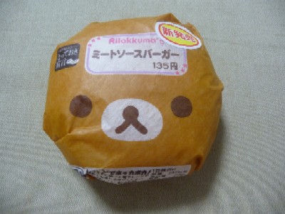秋のリラックマフェアにて。 リラックマとコリラックマのハンバーガーです。 ミートソースバーガーとコロッケバーガーの2種類。 リラックマの 【ミートソースバーガー】135円 257kcalポークハンバーグ、ミートソース。 パテがしょぼい・・・ そして、コリラックマの 【コロッケバーガー】125円