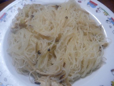 焼きビーフン:219kcal (ビーフン〔174kcal〕、ささみ缶1/2、ブラウンえのきのみそ汁、ポン酢)