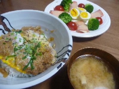 カツとじ、母さん作。サラダ、父さん作。