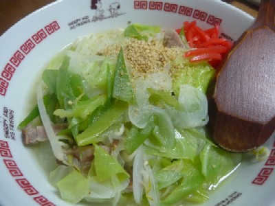 (サッポロ一番 しお〔443kcal〕、煮豚、キャベツ、もやし、玉ねぎ、長ねぎ)