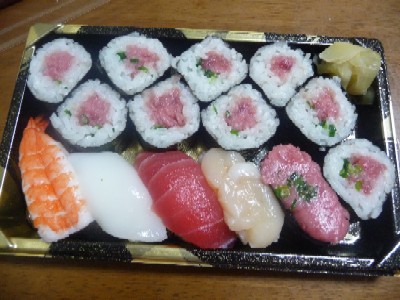 寿司@オーケー:552kcal (えび、いか、まぐろ、ほたて、ねぎとろ軍艦、ねぎとろ巻9つ)