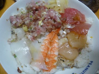 海鮮丼:505kcal (酢飯215g、刺身〔まぐろ、いか、ほたて、えび、ねぎとろ風〕、ガリ)