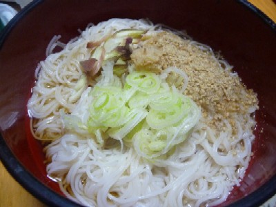 そうめん:409kcal (そうめん2束、めんつゆ+そばつゆ、長ねぎ、みょうが、しょうが、すりごま)