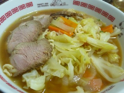 (サッポロ一番みそ、煮豚5枚、キャベツ、玉ねぎ、にんじん、特製辛味噌、酢、七味唐辛子)