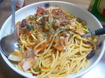 (スパゲティ、ハム、玉ねぎ、ミックスビーンズ、ホールトマト、