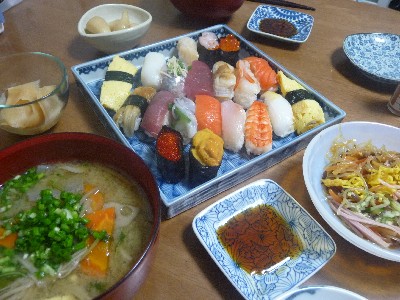 (まぐろ、生げそ、サーモン、はまち、蒸し帆立、えび、いか、とびこ、うに、玉子)