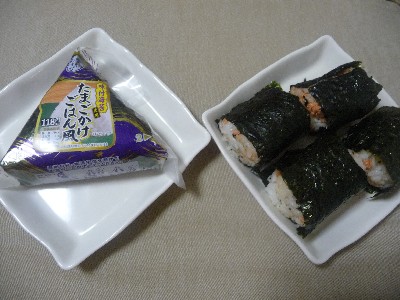 鮭わかめおむすび 4個:397kcal (ごはん200g、鮭フレーク、混ぜ込みわかめ、海苔)