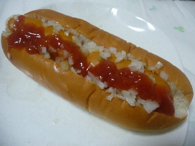 (ホットドッグロール〔135kcal〕、フランクフルトソーセージ2本、ピクルス、玉ねぎ、ケチャップ)