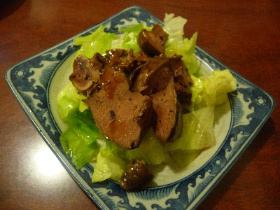 レバーは濃厚。こっくりと甘めで濃い味の味付け。下に敷いたレタスがよく合います。