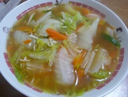 (サッポロ一番みそ 3/4袋:338kcal 白菜・にんじん・大根・長ねぎ:44kcal ウェイパー:8kcal