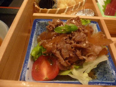 出てきたのは牛肉の時雨煮でした。付け合せにプチトマトとレタス。