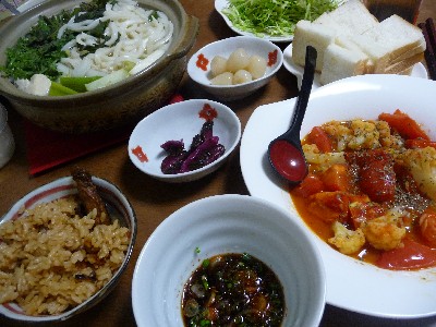 うどんすき風:350kcal (玉うどん、たら、豆腐、白菜、長ねぎ、春菊、えのき、ポン酢)