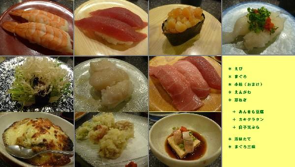 寿司:692kcal (えび、まぐろ、小柱(おまけ)、えんがわ、芽ねぎ、活ほたて、まぐろ三昧)