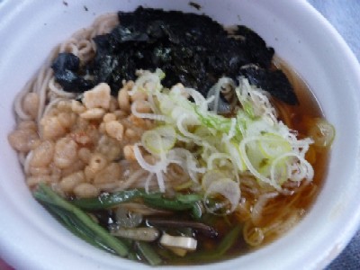 そば、揚げ玉、海苔、長ねぎ、山菜