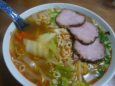 (サッポロ一番 ピリ辛みそラーメン チゲ風、白菜、玉ねぎ、人参、エリンギ、コチュジャン、酢、ラー油)