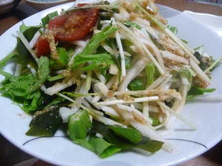 かぶ / プチトマト / 水菜 / わかめ / ドレッシング(醤油ドレ、すりごま、酢、ごま油)