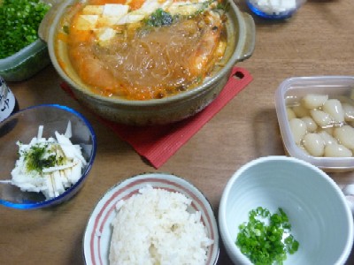 キムチ鍋のだし、小ねぎ)