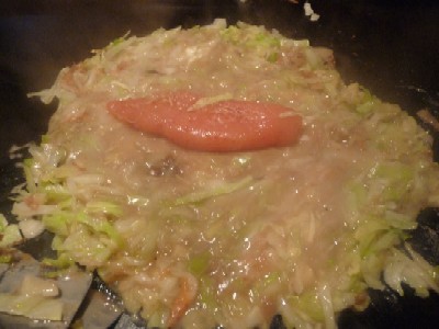 キャベツを切りながら炒めて土手を作って2回に分けて出しを投入し、最後に明太子を入れて崩す。