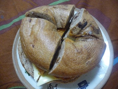 べーグルサンド:540kcal (ブルーベリーべーグル、コロッケ、ソース、チーズ)