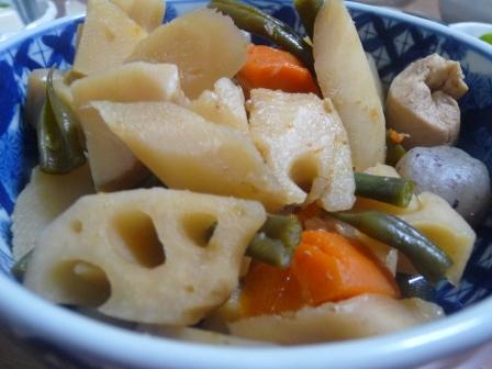 まるまるっとしたこんにゃく、にんじんにごぼう・・・今日は鶏肉といんげんをプラス。