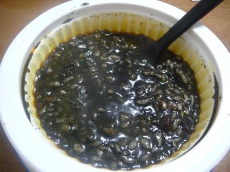 押し麦ごはんでイカスミリゾット 1/2:105kcal(1パック210kcal)