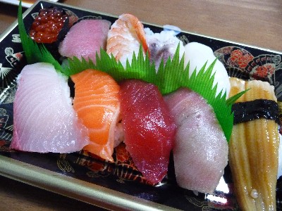 寿司 10貫:540cal (穴子、いか、げそ、えび、まぐろ、ビントロ2貫、いくら、サーモン、はまち)