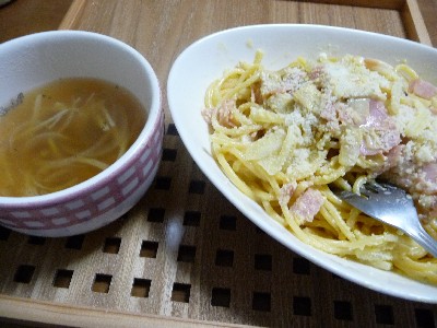 (スパゲッティ、ハム、玉ねぎ、エリンギ、卵黄、牛乳、パルメザンチーズ、調味料...etc)
