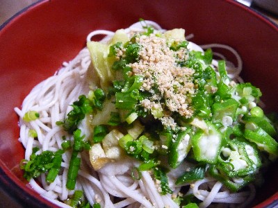 ねばねばそば:470kcal (そば、めんつゆ、長芋、おくら、なす、小ねぎ、すりごま)