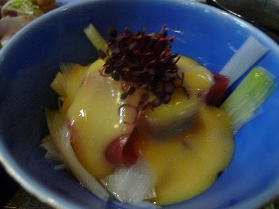 まぐろとねぎとからし酢味噌。からし苦手でも美味しくいただけるくらいの辛味。