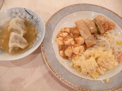 (麻婆豆腐、里芋と野菜の炒め、春巻、ビーフン、炒飯)