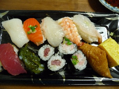 (いか、さけ、たい、えび2、まぐろ、いかめかぶ、さより、鉄火巻2、ねぎとろ巻4、いなり[小]、玉子)