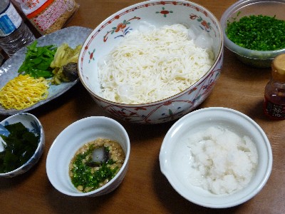 (そうめん、めんつゆ、揚げ玉、錦糸卵、焼きなす、絹さや、大根おろし、わかめ、小ねぎ、すりごま)