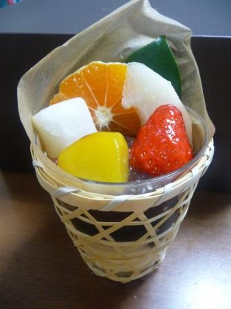 上からフルーツ、あんこ 黒みつ寒天 パンナコッタの3層になってます。