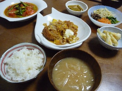 カツとじ:227kcal (ロースカツ、たまご、玉ねぎ、調味料...)