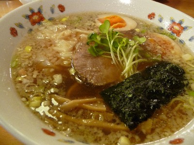 基本のトッピングはワンタン、叉焼、メンマ、ねぎ、のり、かいわれ。
