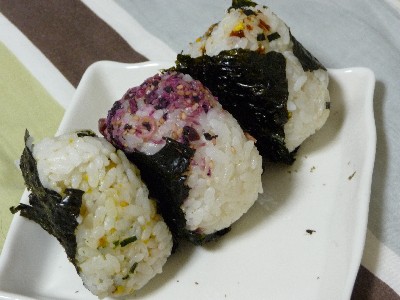 ふりかけおむすび 3種:430kcal (ごはん240g、のりたま、梅ちりめん、味道楽)