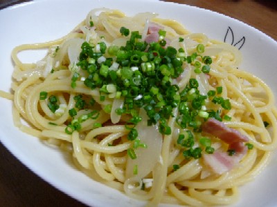 (スパゲティ、ベーコン、玉ねぎ、あさりダシ、バター、パルメザンチーズ、タバスコ)