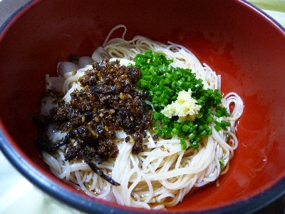 そうめん 錦松梅のせ:235kcal (そうめん1束、めんつゆ、錦松梅、小ねぎ、しょうが)