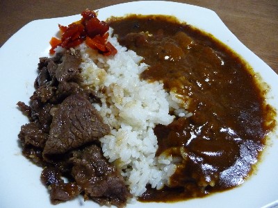 (ごはん200g、カリー屋カレー〔辛口/182kcal〕、牛肉の焼肉風、福神漬け)