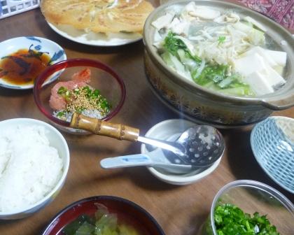 鍋に野菜を入れなかった分、餃子と明太子の和え物でカバー・・・