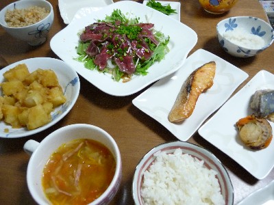 (牛のたたき、玉ねぎ、水菜、しそ、小ねぎ、ポン酢)