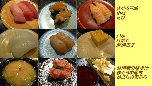 寿司:665kcal (まぐろ三昧〔大トロ・中トロ・赤身〕、小柱、えび、いか、ほたて、まぐろ中落ち)