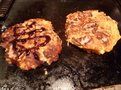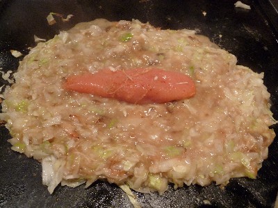 あー!順番間違えた。生地を焼いて裏返す直前に豚肉を乗せてひっくり返すんだった!!